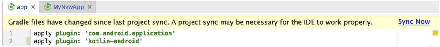 만약에 Kotlin설정이 안되어있다면 아래 스크린샷처럼 위에 노란줄이 뜰것이다.(